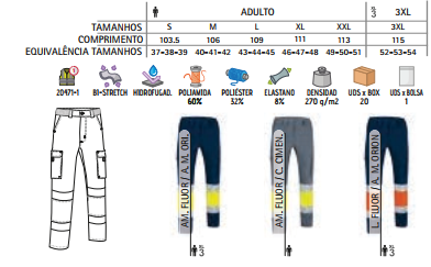 – Confecionado em tecido bi-elástico complex que facilita a mobilidade e acabamento repelente que reduz as manchas, inclui duas listas retrorrefletoras seladas a quente nos punhos das pernas que aumentam a visibilidade dos usuários.