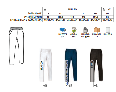– Confecionadas em tecido de sarja mescla de algodão com poliéster para maior durabilidade e resistência.