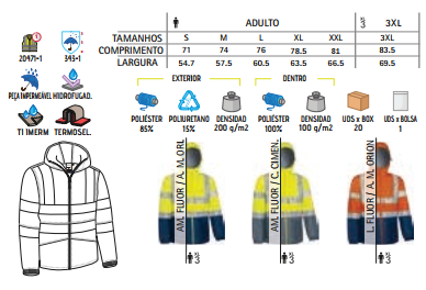 – Fabricado com tecido Canvas impermeável no exterior e forro liso no interior, com duas listas retro-refletoras de calor no tronco, ombros, costas e mangas para melhorar a elasticidade e aumentar a visibilidade.