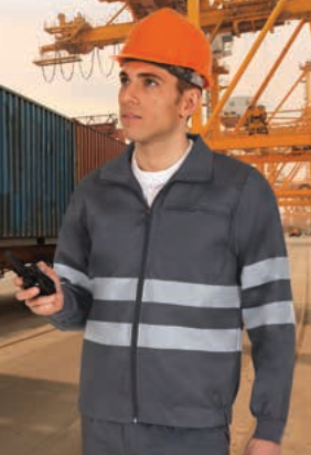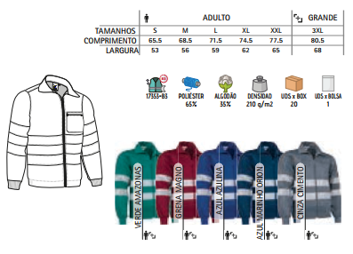 – Confecionado em tecido de sarja mescla de algodão com poliéster para maior durabilidade e resistência, inclui duas listas retro-refletoras cosidas no tronco, costas e mangas para aumentar a visibilidade dos usuários.