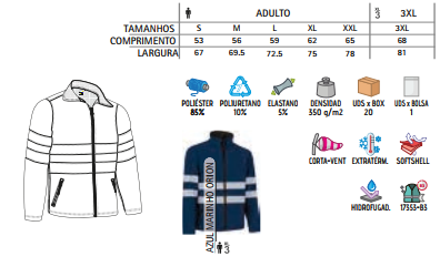 – Confecionado em tecido de três camadas com efeito corta-vento, repelente à água e alto efeito de retenção térmica, inclui duas listas retro-refletoras cosidas no tronco, costas e mangas que aumentam a visibilidade dos usuários.