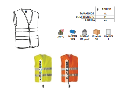 – Confecionado em tecido de ketten respirável e resistente, inclui duas listas retro-refletoras cosidas no tronco e nas costas para aumentar a visibilidade do usuário.