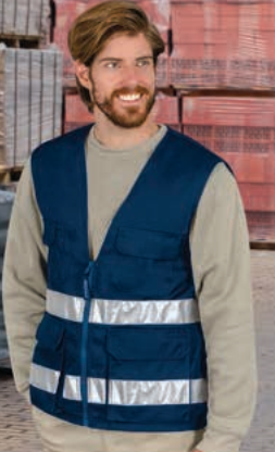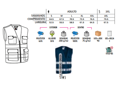 – Confecionado em tecido de sarja durável com revestimento interior de malha respirável para ventilação, inclui duas listas retro-refletoras cosidas no tronco e costas para aumentar a visibilidade dos usuários.