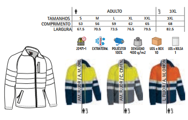 – Vestuário certificado como EPI categoria II de alta visibilidade de acordo com as normas 13688 e 20471, classe 1.
