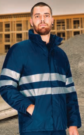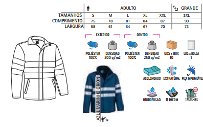 – Confecionada em tecido Canvas no exterior impremeável, forro interior liso e acolchoado interno que proporciona retenção térmica, costuras termo-seladas que impedem a infilltração de água, inclui duas listas retro-refletoras termoseladas no tronco, costas e mangas que aumentam a visibilidade dos usuários.